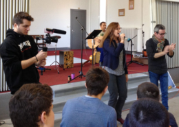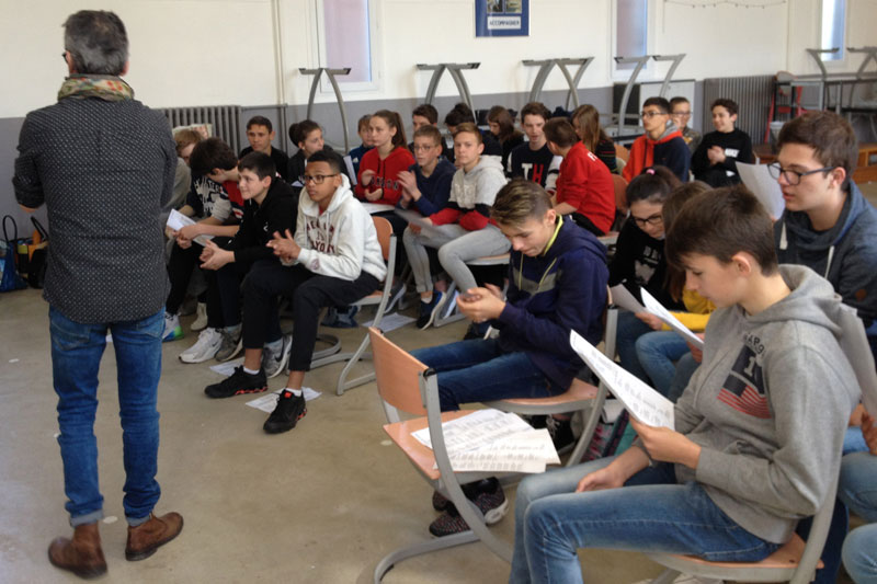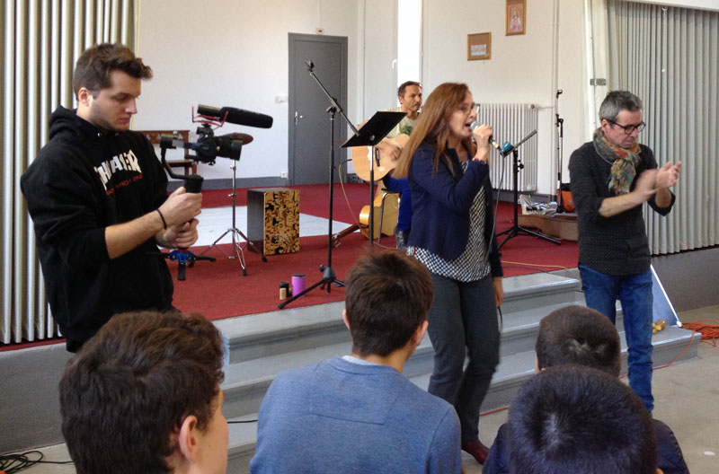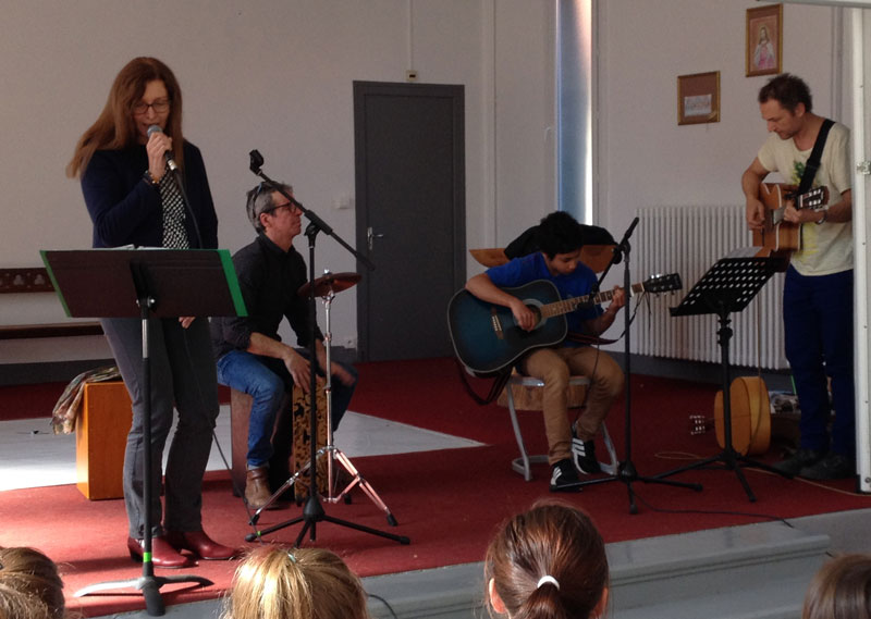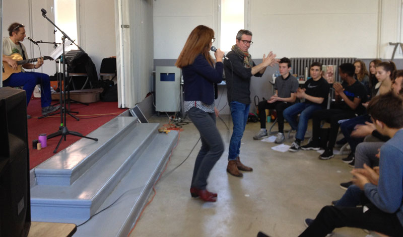 Tous les élèves ont participé à un atelier théâtre interactif avec un acteur anglophone et à un atelier musical en espagnol avec une chanteuse, un guitariste et un percussionniste hispanophones.