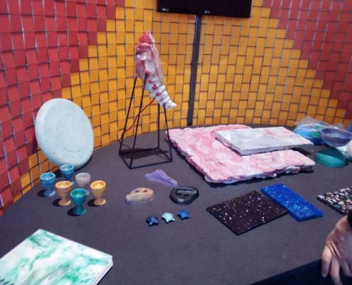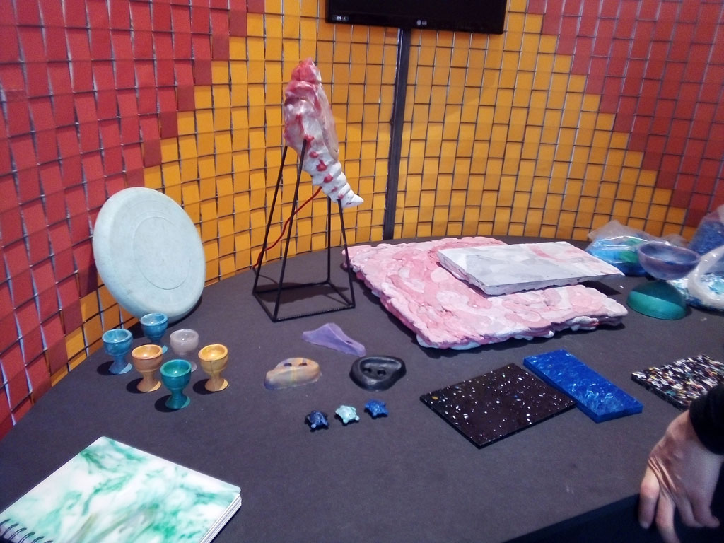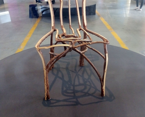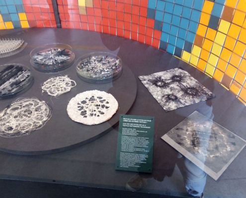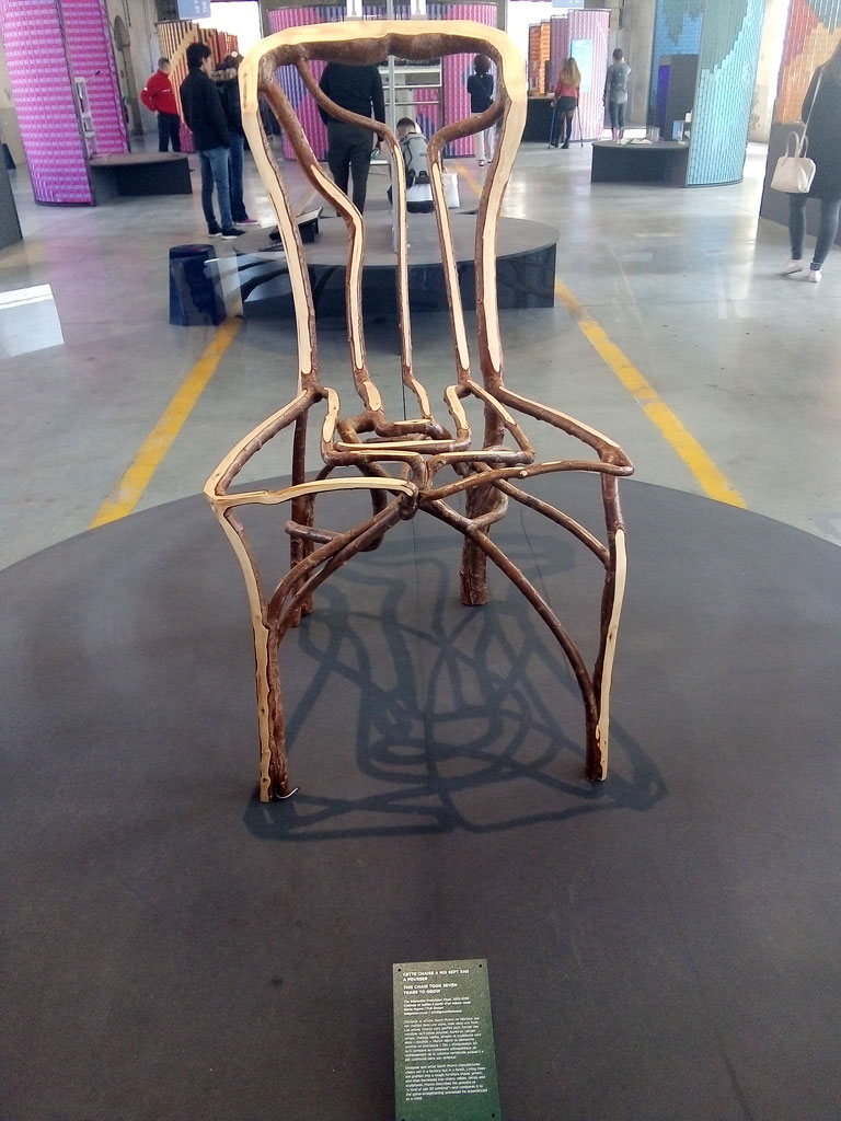 Par exemple : cette chaise qui pousse toute seule, une zone où les artistes questionnent la matière plastique pour le futur, ou encore les matières « vivantes » ici des champignons : mycélium.