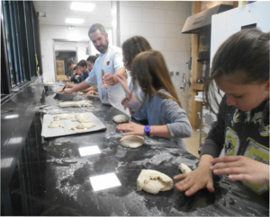 Ici, les élèves découvrent le moulin à farine, puis les étapes de la fabrication du pain et mettent la main à la pâte.