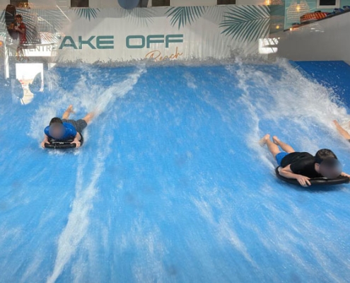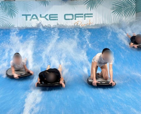 La session a débuté par un briefing de sécurité et de fonctionnement concernant la vague. Les élèves ont ensuite pu se jeter à l’eau depuis un point précis pour se laisser glisser et remonter. Après plusieurs passages, ils ont pu utiliser les planches en étant allongés, et certains ont même réussi à se mettre à genoux et à lâcher les mains.